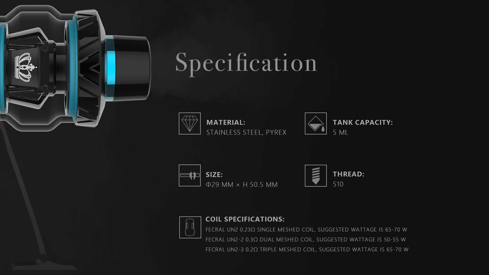 Von Unten werden die UN2 Coils aus Kanthal eingesetzt. Diese bieten besten Geschmack und ein grosses Dampfvolumen. Die Coils sind in verschiedenen Ausführungen erhältlich, so sind im Lieferumfang ein UN2 0.23 Ohm Single Mesh Coil für 65 bis 70 Watt und ein UN2 0.3 Ohm Dual Mesh Coil für eine Leistung von 50 bis 55 Watt. Weiter ist auch ein UN2 0.2 Ohm Triple Mesh Coil für 65 bis 70 Watt erhältlich.