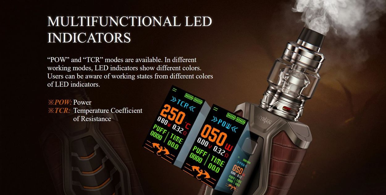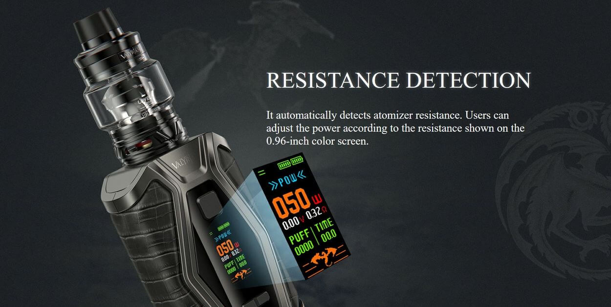 Der Mod verfügt über ein 0.96“ grosses Farbdisplay auf dem alle wichtigen Information mit einem Blick ablesbar sind, auch bei hellem Sonnenlicht. So bist Du immer bestens über Deinen Wattbereich, Akkustand, Modus und Verdampferkopf Widerstand informiert. Die Valyrian III Mod nimmt Verdampfer bis zu einem Durchmesser von 30mm nahtlos auf, alle Einstellungen erfolgen über die beiden Einstelltasten und dem Feuertaster. Die Taster selbst haben einen deutlichen Druckpunkt und geben ein gutes haptisches Feedback bei der Bedienung. Dadurch dass der 510er Anschluss mittig liegt, ist die Symmetrie beim Valyrian III perfekt balanciert.