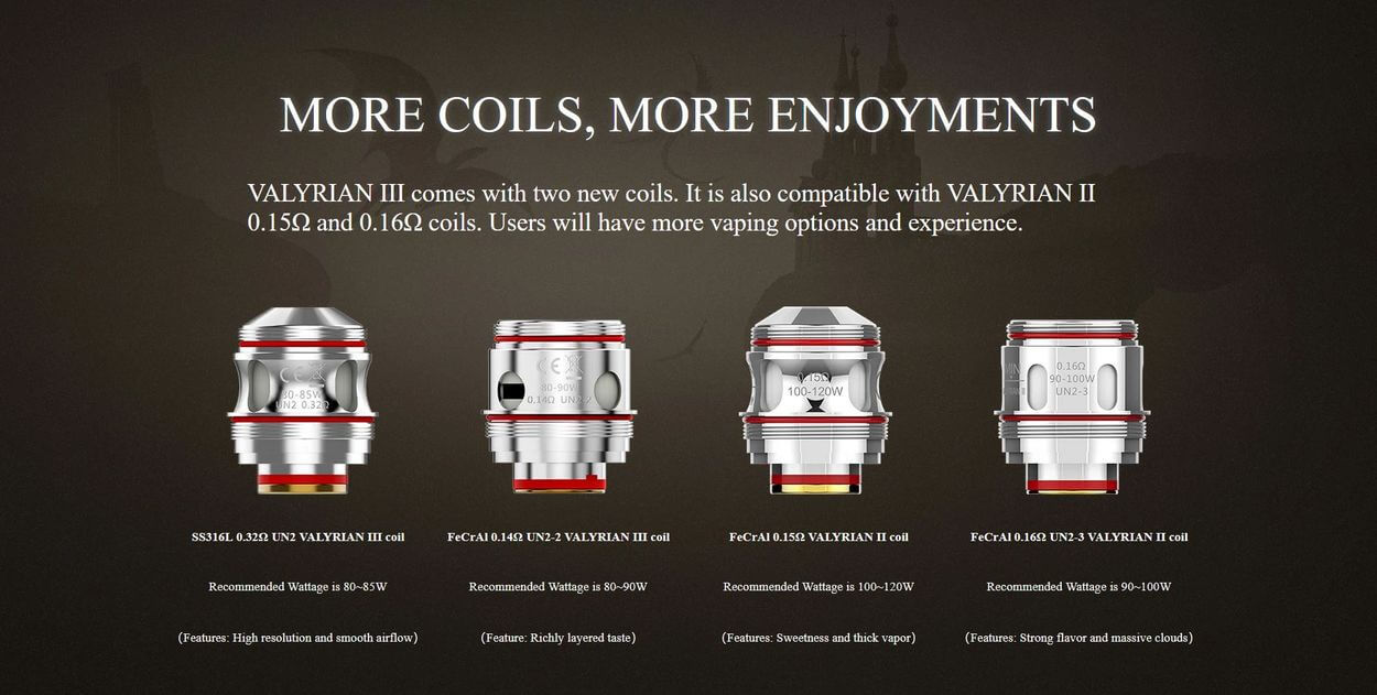 Die Verdampferköpfe gibt es im Widerstand von 0.32 Ohm (Edelstahl) und 0.14 Ohm (Kanthal) die Verdampferköpfe vom Valyrian II sind mit dem Valyrian III kompatibel. Das Tankvolumen beträgt satte 6ml, gefüllt wird er von oben. Der Valyrian richtet sich deutlich an die Dampfer die gerne eine satte Wolke beim Dampfen bevorzugen, es wird direkt auf Lunge gedampft aus dem Grund ist der Zugwiderstand gering, die Bottom Airflow lässt sich stufenlos regulieren.